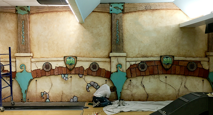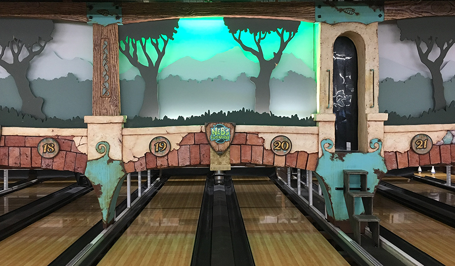 Our part in NEB's bowling alley project is now complete. We've done the touchup to our pieces and the finishing of the end walls. The signs are now all in place on this phase of the project. But the work there is still ongoing. The ceiling panels are yet to be installed as are a few posts. The NEB's crew are also adding some very dramatic and exciting lighting effects which will take the project over the top and make it truly one of a kind. Even though this phase is complete for us we are far from done. Today was spent dreaming up brand new adventures which we will be designing and building in the coming months. This is going to be a whole lot of fun! Stay tuned...
