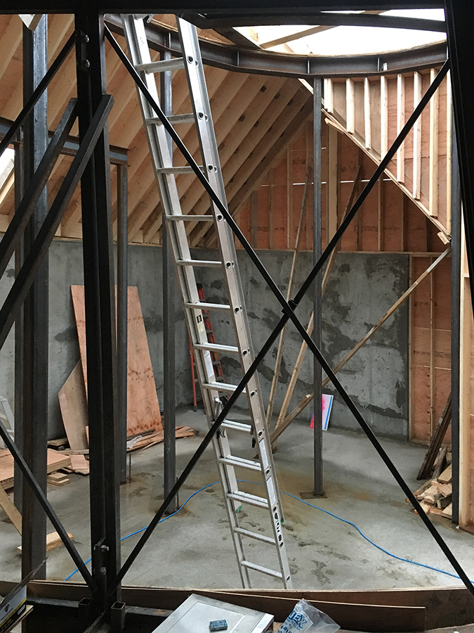 As we walk through theNorth Star Suite of the Hazelnut Inn the size of the room is now clearly evident. The suite is about six hundred square feet and with vaulted ceilings it seems much larger. The domed tower ceiling which will start at the bottom of the circular beam and will be framed this coming week. Once the framing of the walls and roof is complete we will removed the bracing from inside the ship and then begin the stairs and the multiple raised levels of the room. By the new year we should be able to begin the detailing of the interior of this suite.
