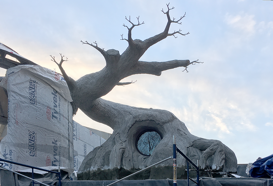 With each passing day the Hazelnut Inn comes a little closer to the final form which we envisioned from the beginning. The carpenters have now finished sheeting the roof on the North Star suite. That clears the way for our crew to move safely below. We are busy stapling on the weather barrier and lath on the walls in preparation for the fancy carved plaster work. The waterproofing is complete on the roof of the Underhill and the tree is extended down to the roofline. That clears the way for the roof landscaping next week. The crane, soil and sod are booked for Tuesday morning and the roof is about to get green!