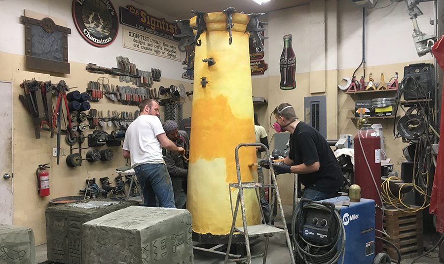 Things are getting a lot more colourful in the shop as the paint and glazes go onto the completed features of Hazelnut Inn. The electrical tower got it's glaze today. The effect was subtle but effective as they started at the top and worked their way down. The glaze was a deep school bus yellow as they brushed a thick coat on, but toned down as it was towelled it off judiciously. It won't be long until the three large pieces of this feature are ready to be pushed out of the shop to make room for more.