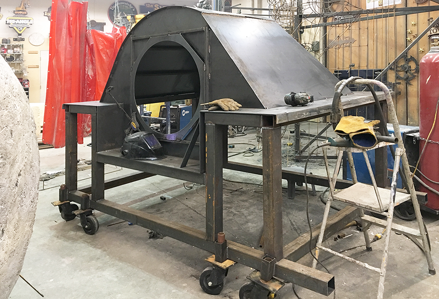 The tree is relatively simple structure, and a familiar build for us. The difference this time is that the tree needs to be waterproof so the underground suite stays nice and dry. Our solution was to build a heavy welded steel cover which will act as a giant flashing as it fits over the rectangular hole. The structure of the tree will be welded to it with no penetrations which might allow water to seep through. Tomorrow this piece will be complete and the actual build of the tree frame will begin. When we are done absolutely none of this important preliminary work will be visible to our guests.