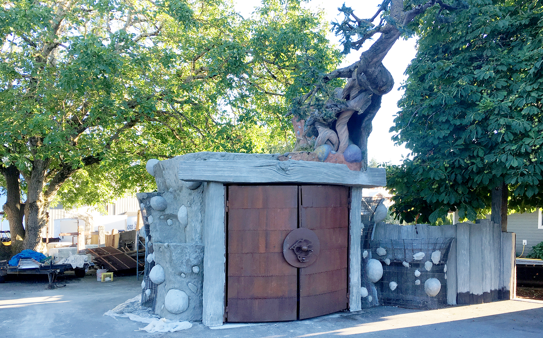 We are doing our best to finish up many projects around our property before the Hazelnut Inn project gets underway next door. One such project is the garbage shed. Our business, like most has a giant there cubic yard garbage bin. It is rather unsightly but it needs to be in the driveway so it can be collected when it is full. Our solution was to house it inside a 'mountain'. The project was begun shortly after we purchased our property in June of 2003. We got as far as building the structure and the tree on top. But the property plans were in flux back then and it couldn't be finished until it had a permanent home. It was moved four times before it landed where it currently sits, after the house was finished. A addition was added on the rear to house all of the garden tools and lawn mower as well. Each year, as we find some spare time, we do a little more to finish things off. It is our hope that it may actually be finished this summer. We added some sculpted concrete work today and more work is scheduled over the next couple of days. Once it is painted we will add the soil and landscaping materials to bring it to life.