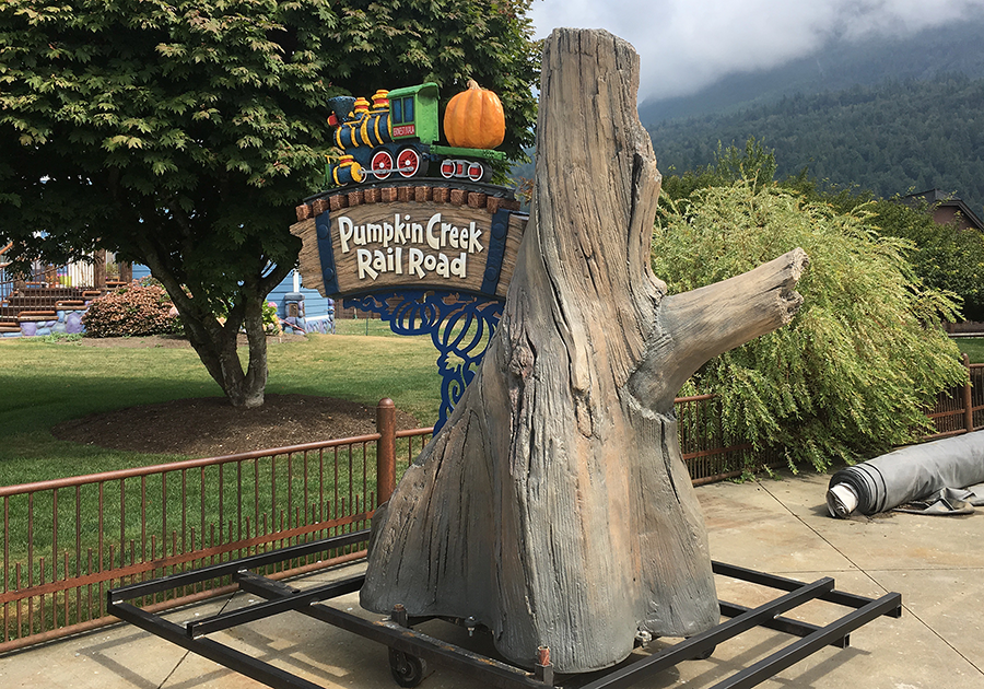 The Pumpkin Creek Railroad sign is one of my favourite pieces in the Vala collection. Our crew did an awesome job sculpting the tree while Alyssa did the bulk of the painting under Becke’s watchful eye. The sign was definitely a challenging piece with far more detail and time invested than one might think at first glance. I can hardly wait to see it set in its final home in front of the train station. In about a month the first guests of this year’s season will get to see it for themselves.