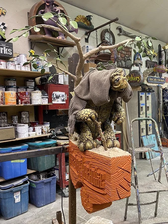 Tortoises are generally found where it is nice and hot. With winter now on us our tortoise ended to bundle up. The reality is that as I am painting the leaves and branches over him he needed a little protection from splatters and drips. The sign is getting more colourful all the time..