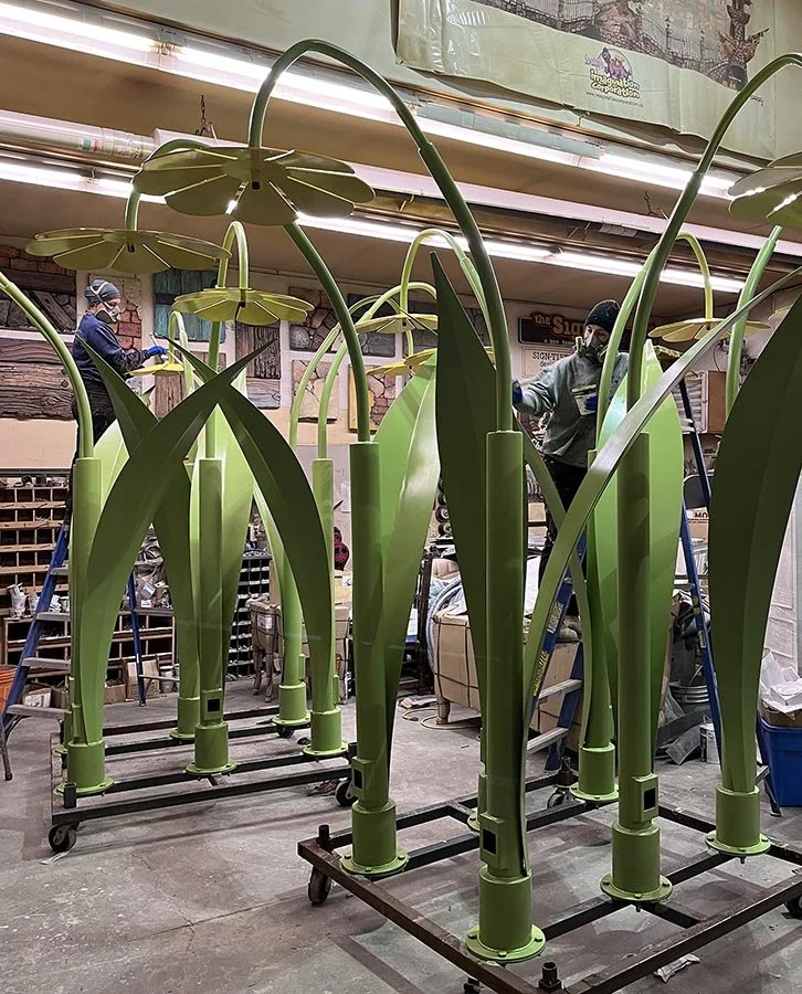 Krysia and Kendra are down to the last coats of paint on the giant flower stalks which will act as lights for the Secret Garden golf at Castle Fun Park. The massive plants are looking great and will soon be moved out of the shop to join all of the rest of the pieces.