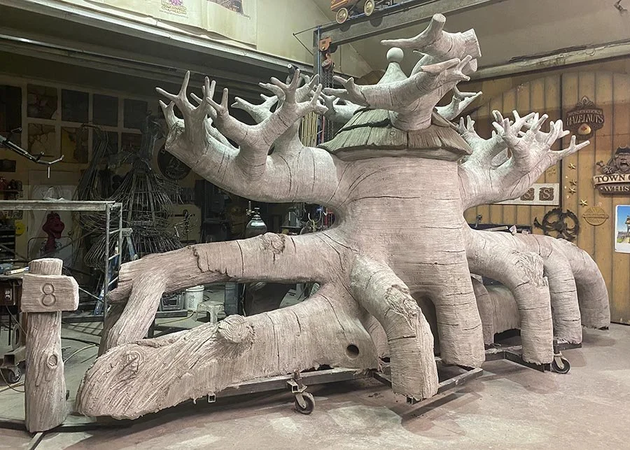 Today, we did the last of the sculpting on the old man tree feature for the new Secret Garden Mini Golf at Castle Fun Park. The final task was to sculpt the thick, ‘wood’ shingles on the roof. They turned out great! The tree is massive, measuring almost twenty feet long, eight and a half feet wide and about ten feet tall. This photo shows the back side of the tree. Once the sculpting was complete we did a last cleanup to ready the piece for paint next week. Stay tuned…