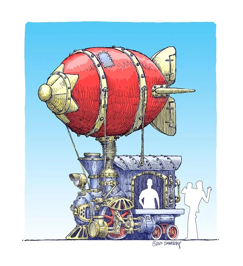 It’s no secret that I’ve long loved steam trains. As I was dreaming up a front facade for a theme park kitchen I decided a steam train might be cool. But as usual, things quickly got out of hand and I quickly fell in love with the idea of a steam train dirigible. That would definitely be fun! This idea really flies in my mind!
