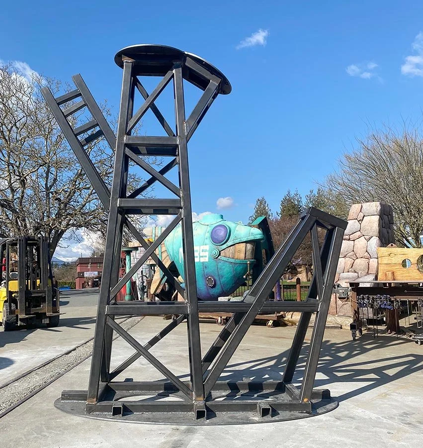 The giant mushroom castle which will be bound for Castle Fun Park is coming along nicely. The midsection of the structure is largely complete and will soon be getting the pencilled armature welded into place. If you know the final form and use your imagination it is already looking like a giant castle. Trust us…. it’s there!