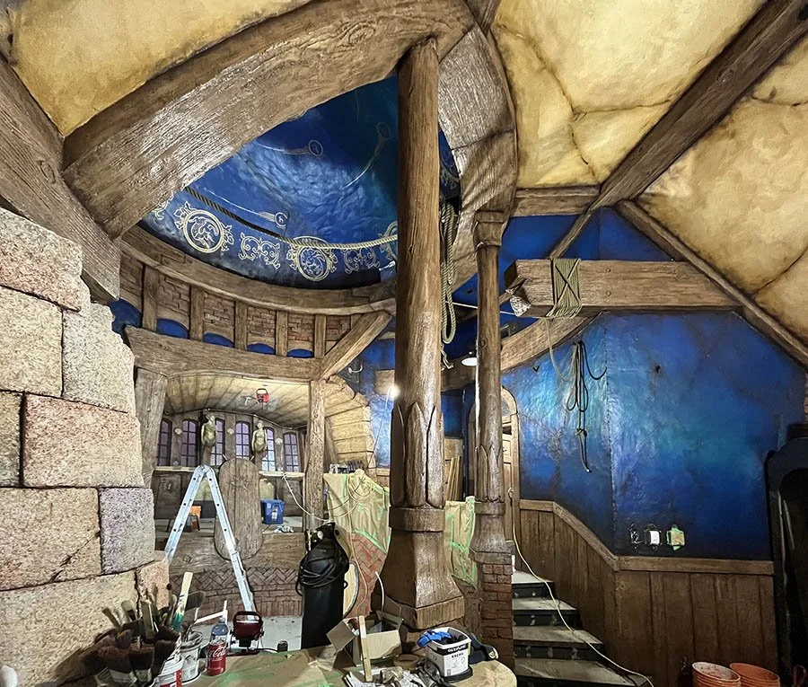 It was a landmark day inside the North Star suite as the last scaffolds were taken apart and removed at long last. While at it the crew did a general cleanup and removed all unnecessary supplies and tools. we can now walk freely throughout the multi-level room and see from one end to the other. The next few days will be spent doing the last of the glazes and touchups. The electrician comes on Monday to install the fixtures and then we will see the room in the proper light. Stay tuned…