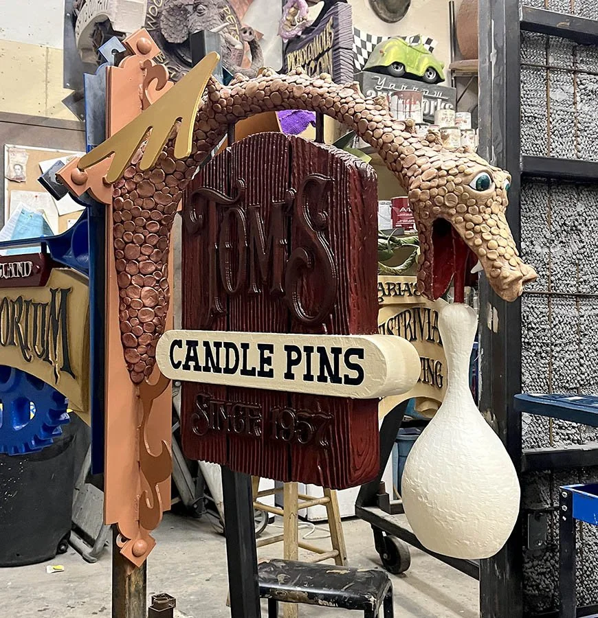 Tom’s Candle Pins sign is also nearing completion. The bulk of the painting and glazing are complete, with small details remaining like the highlights in the eyes, stripes on the bowling pin and glazing on the bracket. The 23K gold leaf lettering will be the final bling to take this sign over the top. Stay tuned to the final steps…