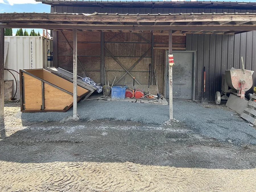 Much of our work is done behind the scenes. Our concrete mixing area is such a place. This work area is situated behind our shop. Each summer, as we complete the year’s projects, it is time to freshen up this area. The mixer is moved to the side and our little backhoe is used to break up the built-up concrete surface which forms as we formulate our concrete and from washing out the mixer. This can become as thick as six inches around the mixer over time. In a couple of hours, I dug up and moved about five cubic yards of debris with the tough little machine. This was loaded into our dump trailer and with each trip to the gravel pit I back-hauled fresh gravel to create a new, well-draining surface which would last until we do it all over again. Each year we strive to make improvements to ensure this area is as efficient as possible. Improvements this year included a new, second bin which will be used for our coarse sand. I did the tractor work over the weekend to ensure we can get this area back into production this coming week on the last of the features for Vala’s Pumpkin Patch.