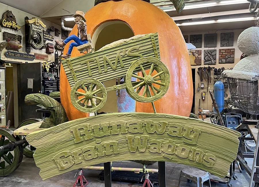 The many projects soon to be bound for Vala’s Pumpkin Patch in Gretna, Nebraska are now all in their final stages of paint and glazing. This is one of the smaller pieces - a sign for a new roller coaster currently under construction on the farm. In eleven short days, we will load the truck which will haul the precious cargo to Nebraska. We will be counting on our friends Wishlow Cranes and JD Transport to once again pull through for us. As always, the crew are working as one to make sure all is done to perfection and finished with a little time to spare. Shortly after the truck is on the way, I’ll also head south to greet the special cargo as it arrives and supervise Vala’s crew as they install all these pieces perfectly in their new home.