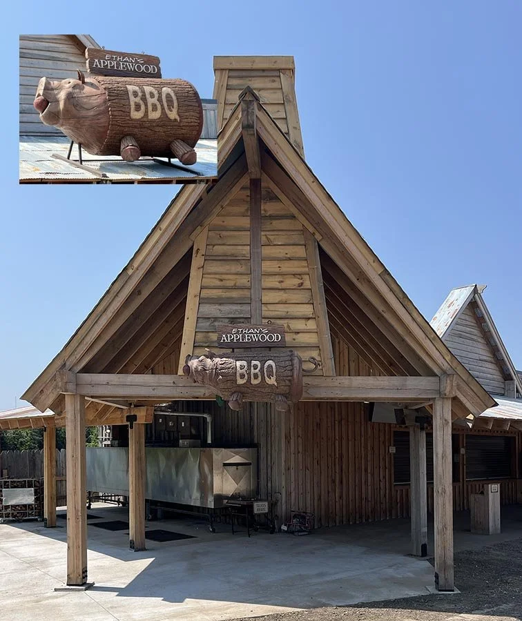 We designed and fabricated the two signs for Nathan’s Applewood BBQ. The larger of the two was installed on the yet-to-be-completed building. The Vala’s crew was in a mad dash to finish and open the new Apple Cider area of the farm. They made the opening but the A-frame porch was put on hold. The smaller of the two signs was placed in a planter as a stop-gap measure. Last year, the sign was still in the planter as the Vala crew worked on other exciting projects. As I visited the fam this season I was delighted to see the BBQ building had been finished and the smaller of the log signs was in its rightful place. It is nice when a plan comes together - even if it takes a while.