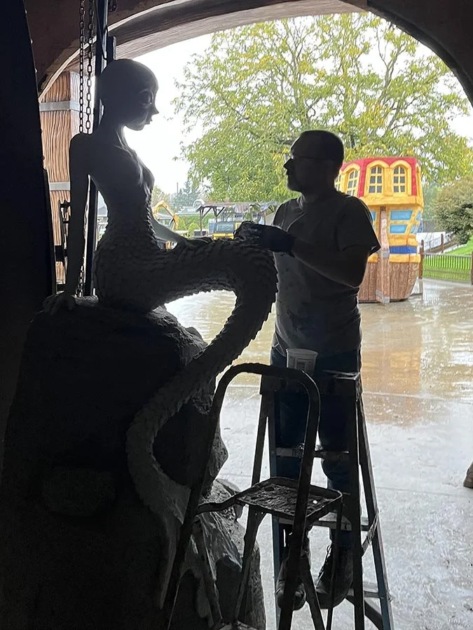 We are in the middle of our first fall storm, and the power failed in the afternoon. We dragged out the generator to light up the Copper. Crown Suite for the sculpting crew in the Hazelnut Inn. Peter and I swung open the big shop doors so we could continue working on the mermaid sculpture we are creating for Vala’s Pumpkin Patch. We made great progress despite working in the dark. The figure is now substantially finished, and we will next move on to her hair before we start in on the paint. Stay tuned…
