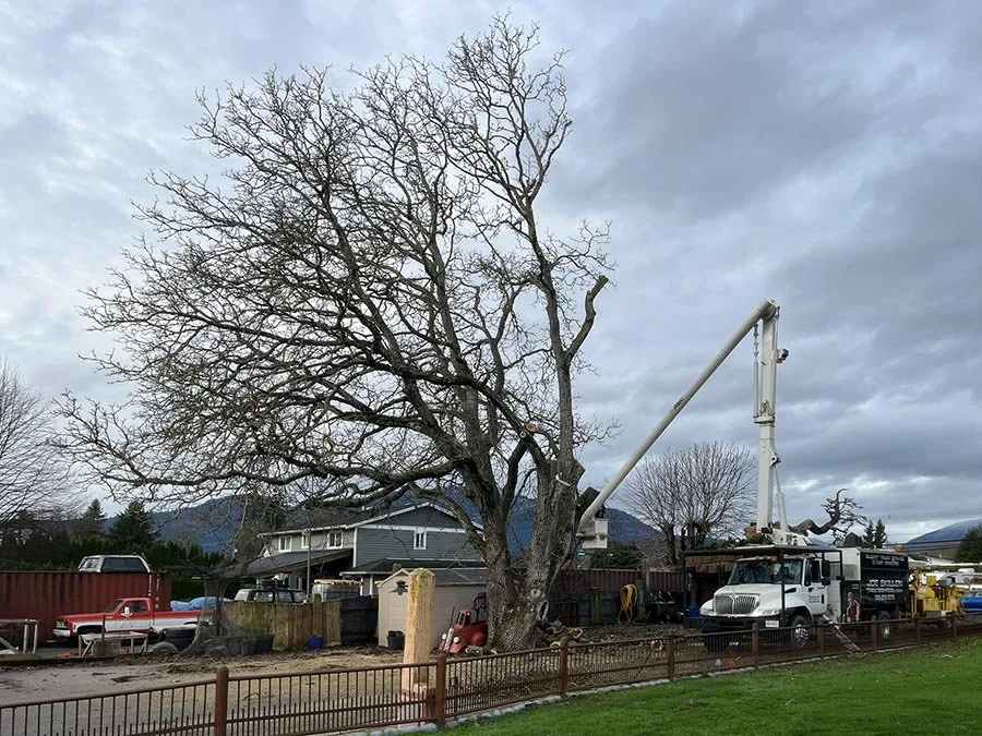 Today a skilled crew began the sad task of removing the giant walnut tree that has lived in our yard for almost a century. The tree was one of the wonderful things that made us fall in love with the property when we bought it almost twenty-three years ago. It was most likely one of the first trees planted when they reclaimed the land that was Sumas Lake in 1928. Our old house (gone for ten years) was one of the first constructed when this area was settled by the Mennonites. Over the last years we’ve watched as the branches of the giant gradually died off from the tips. Recent wind storms have brought down some large limbs and we, along with our arborist, in the interest of safety, felt that the inevitable could no longer be put off. In anticipation of this day we began planting new trees twenty years ago and they have gotten to be of good size. Even so, this old giant beauty will be missed.