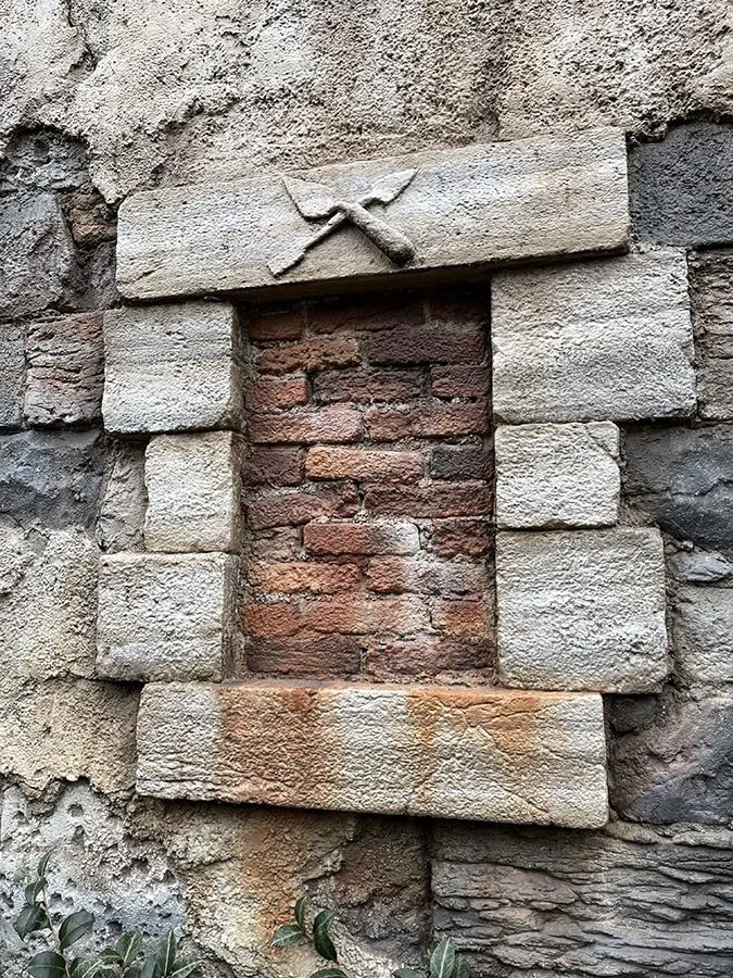 As Matt and I explored the DisneySea masterpiece, we located a few of these. This ‘signature’ was hidden in plain sight in a back alley of the park tucked behind a tree, where only a few guests would venture. The crossed mason’s trowel and pointing tool were carved into a lintel over a tiny window filled in with brick.