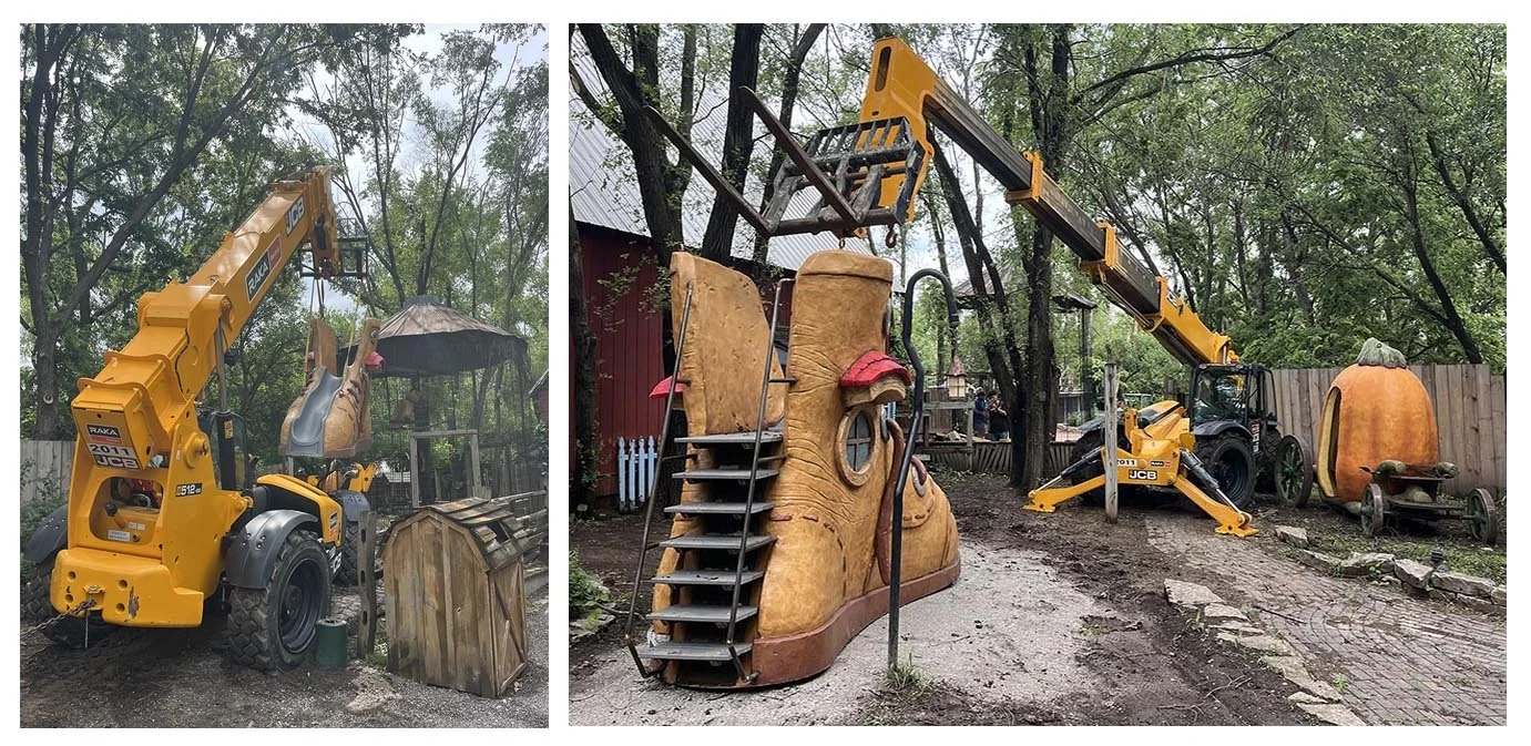 We first walk each route with a tape measure in hand, trimming the odd wayward branch or instructing the crew to temporarily move trash cans or portions of fencing. Planning is easier and faster than repairing. Then the crew rigs the pieces on the pre-engineered lifting points we built into the features. The pieces are moved at a walking pace with lookouts on all sides in critical areas. Today’s surprise was a heavy downpour last night, which made the ground soft and slippery in places. At one point, the zoom boom lost traction, but a large four-wheel drive field tractor piloted by one of Vala’s skilled crew saved the day with a little tug. The old woman’s shoe slide feature was gingerly wiggled into position in Storybook Land with inches to spare. Tomorrow, the fun challenge begins anew as more of this year’s features are moved into place. Stay tuned….