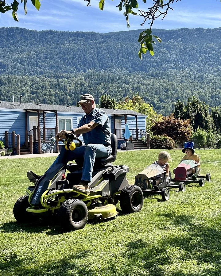 Having two businesses and two homes on adjoining properties affords us the luxury of having a very large yard, a little more than two acres in all. That means there is a whole lot of room for all kinds of fun! Last year, the kids inherited two homemade soap-box racers from my uncle Bob. It was fun to push them around for a while and coast down the small hill in the backyard. But the need for speed quickly became apparent, and Grampa’s electric lawnmower proved to be just the ticket for a fast ride - especially on a somewhat bumpy lawn. This is the new favourite thing to do - until we think of something new and exciting.