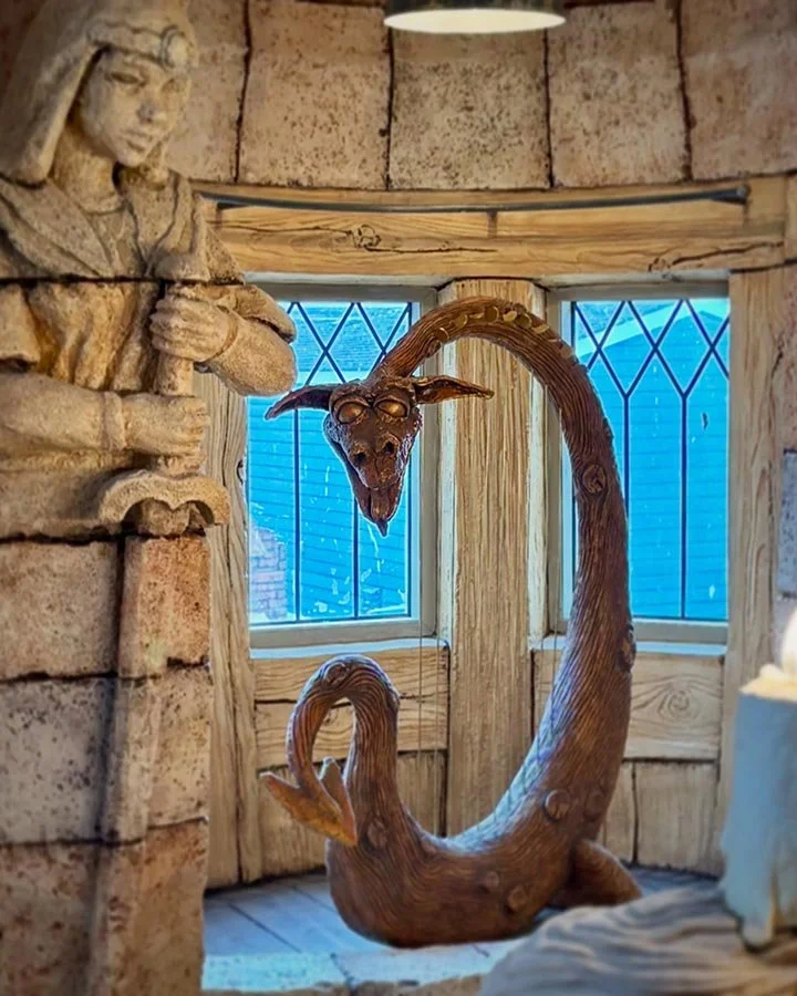 Peter couldn’t resist immediately hauling the harp out to the Copper Crown Suite of the Hazelnut Inn as soon as we completed it. He reasoned that it might get dirty in the shop, despite the Inn also being a construction site at the moment. The harp fits perfectly into the upper tower space and will be one of many treasures to be discovered by our guests when they dwell in this magical space.