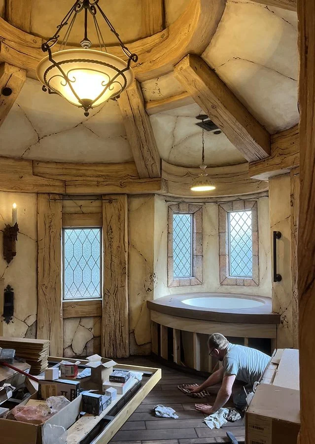 Peter and Matt have completed laying the complex, detailed tile throughout the upstairs of the Copper Crown, which means it is finally time for the gouting to begin. He got a good start on the section around the king-sized bed. Tomorrow he will start on the rest, and by the week's end, he should be working his way down the stairs. Stay tuned…