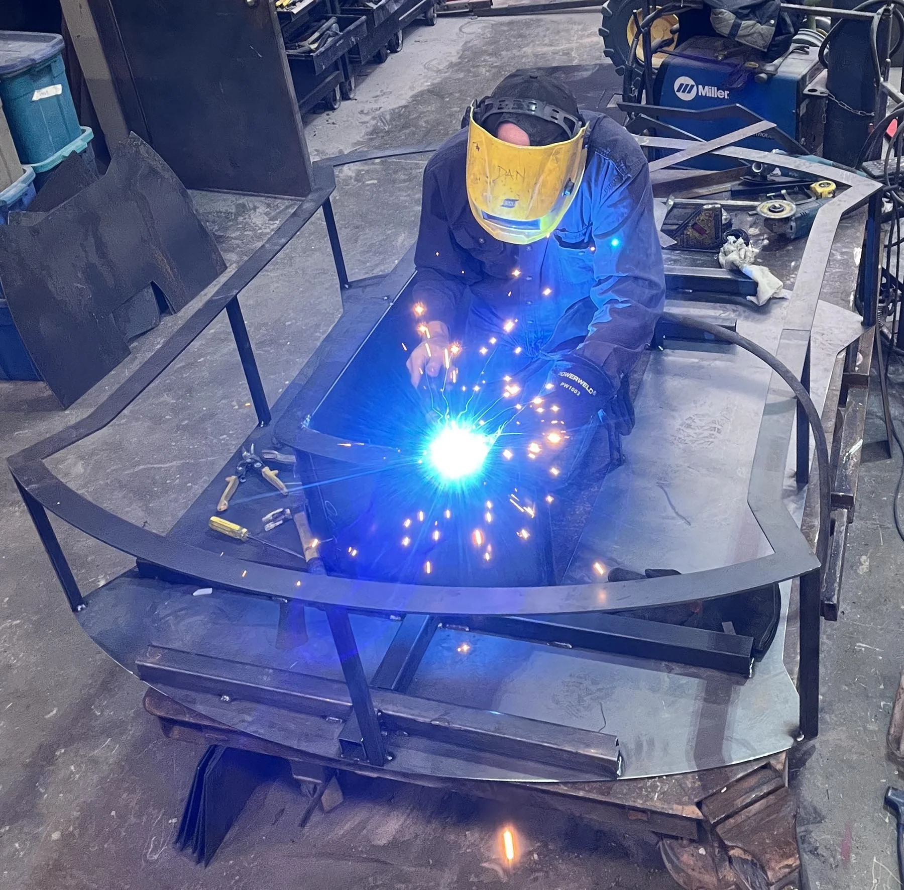 The ‘O’ is plenty big enough for us to climb up onto the welding table into the middle for a comfortable way to weld and grind the center walls of the letter. This letter has a little over 70 linear feet of weld. We made great progress today with all the pieces welded into place. Tomorrow morning, Laura will do the grinding. We can then flip the ‘O’ and then weld up the back edges. It won’t be long until we start the third of seven letters for Downey’s Farm. Stay tuned…