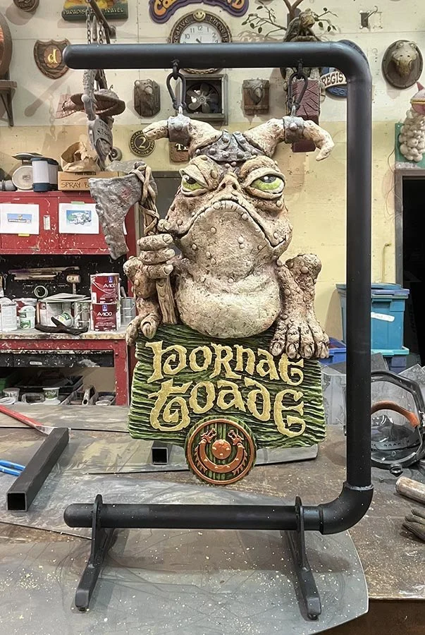 Most projects I dream up start as small, simple ideas, but as I start designing, things seem to instantly grow, sometimes out of control. As I draw, new ideas pop into my head, and I know if I don’t include them, the project won’t be nearly as much fun or cool as it could be. The same thing applies to scale. This year’s Sign Invitational entry was theoretically supposed to fit in a suitcase to transport it to the ISA show. But as I thought of how it might be treated by the baggage handling equipment as it went through luggage at the airport, I thought it would be better to send it via freight instead. Suddenly, weight and size weren’t nearly as critical, and without even trying, the pieces I am creating began to grow even more. It didn’t seem like much at first, but things may actually have gotten a little out of hand over the last few months. Another custom sculpted piece I recently sent down to the US was built around a crumpled tinfoil armature to make it lightweight. But customs folks must have put it through their X-ray machine and couldn’t peer into the center, so they smashed the little sculpture into many pieces, found nothing inside, wrapped it up again and sent it to my customer. I didn’t want a rerun of that scenerio and that meant there would be no lightweight tinfoil center, and so I used laminated Precision Board HDU blocks to build the armature. Of course, the heavier weight of the armature meant a heavier welded steel armature frame inside. The now much heavier weight of the piece made me once again reconsider how I would ship it. My original thought of packing the pieces with lots of bubble wrap surrounding them now doesn’t seem like nearly enough to protect the signs. So it was back to the drawing board. As I was fabricating a sturdy welded steel mount yesterday for inside the now rather large shipping crate, the simple frame turned into a fancy, full-blown welded framework that will hold the sign upright during transport. It looked so good, I gave it a rattle can paint job. As I studied my marvellous creation, I decided this shipping frame could act as a display stand with the frame perched on top of my shipping crate. I’ll have to build that extra fancy as well. I love how a well-thought-out plan comes together! But the thing is, my entry is now so heavy I’ll have to ask one of my competitors to help me lift my pieces out of the crate to set up the display. I can hear the protests already…
