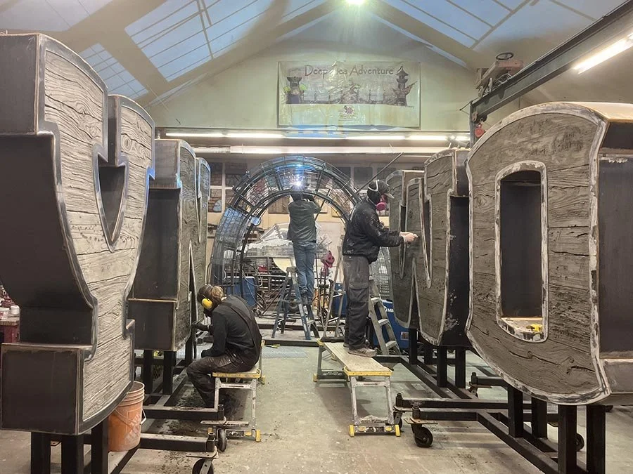 People who visit us are most often surprised that our shop is not massive, nor is our crew large. There are only five full-time members on our team, and the main shop measures only 30’ x 40‘ with two small additions for the CNC router and plasma table, plus the studio. Although we each have our favourite tasks in which we excel, every member of the team happily helps out with all the jobs to make the work flow through the shop quickly. A medium-sized piece would typically be in the shop only 2-4 weeks at most. The key to producing the work we do is being somewhat organized and flexible. Although it can seem chaotic at times, there is a purposeful workflow and plan. We fabricate all of our features and signs on wheeled frames to allow them to be juggled around the shop as needed. Generally, the pieces in fabrication in the shop are in a variety of phases. We first weld the structure, then the pencil rod armatures, followed by the attachment of the diamond lath. A typical piece would take 5-7 work days to be at this stage. Sculpting is best done in just the right-sized batches so that we can mix, trowel on the fibreglass-reinforced concrete, fully sculpt it, and clean up by quitting time. The features are then allowed to cure for 3-5 days before we begin the painting and glazing, which takes another 5-7 days. This shot captures a typical busy, productive day in the shop.
