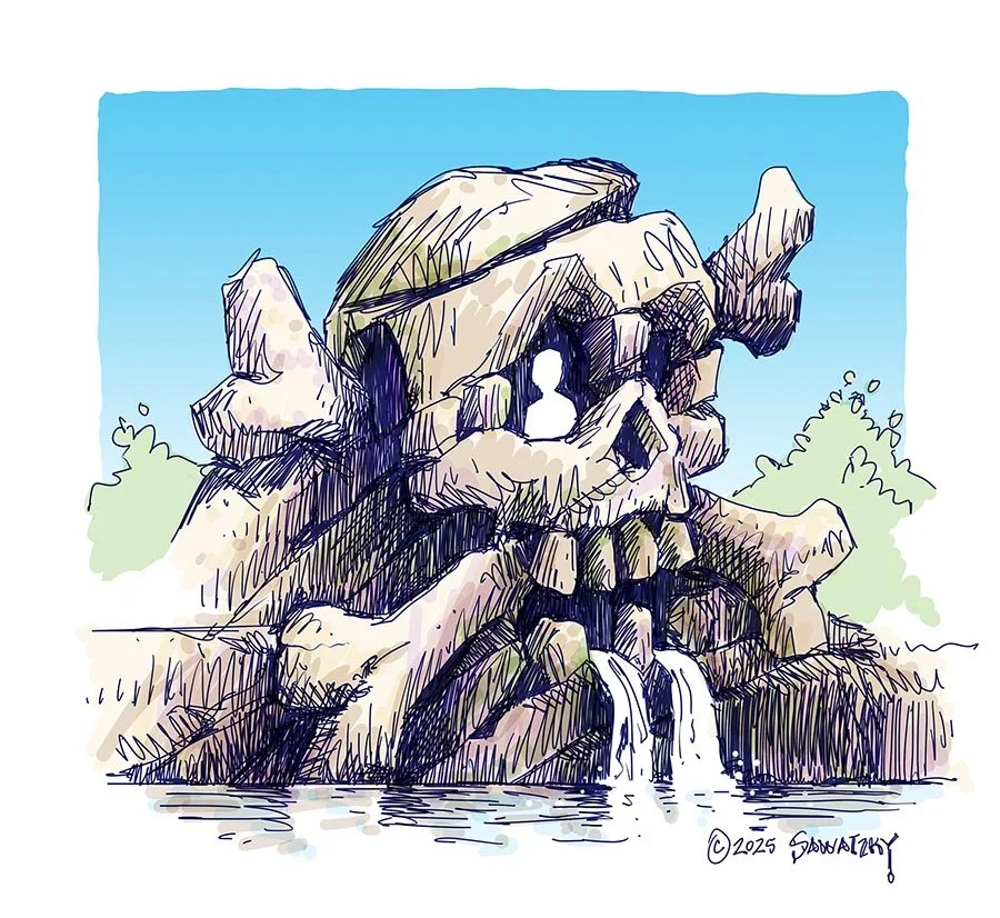 This week, we begin a feature I’ve been dreaming of for quite some time. It all began in Pigeon Forge last spring, when I was sitting by a fountain with our client from Nebraska, waiting for the rest of the group to join us for supper. He tasked me with dreaming up an idea for ‘Skull Rock’, inspired by a long-gone feature at Disneyland in California. The feature would complement the pirate-themed mini-golf already in development for Vala’s Pumpkin Patch. Fortunately, I had my sketchbook with me and got right to work. I drew up a quick sketch and presented the idea to everyone before our meal was served a short time later. They loved it, and once I had reworked the sketch to be a finished presentation drawing a few days later, it was incorporated into the golf. This coming week, it will be our task to begin to make this drawing as large as life using welded steel and hand-sculpted concrete. This is going to be both challenging and fun! Stay tuned…
