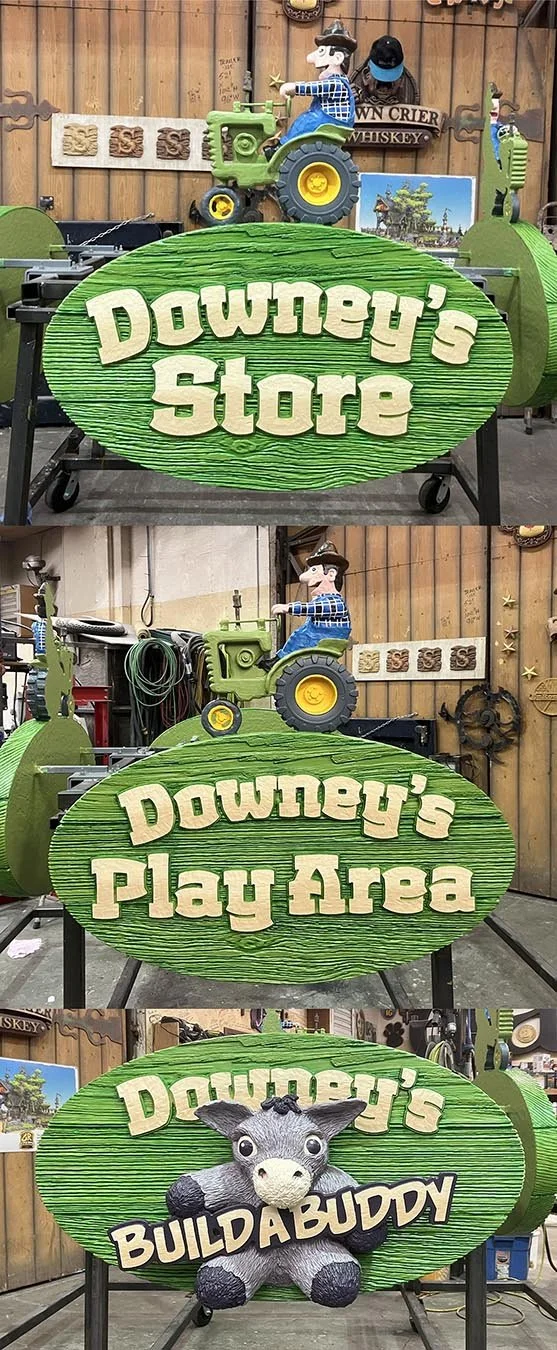 The three smaller Downey signs are now substantially complete, and tomorrow morning, one final coat of paint will be brushed on the letters, along with a few minor touch-ups to the rear faces, to complete this portion of the order. The extensive metalwork on the D of the DOWNEYS letters will also be finalized by coffee break tomorrow, making all of the letters ready for the welded pencil rod lath, which is the next step. By weeks end, the letters will be prepared for the sculpted concrete. Stay tuned…