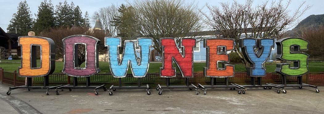 The giant DOWNEYS letters are now complete, out of the workshop and rolled into the parking lot. They are ready to load and be on the way to Downey’s Farm late next week. At the farm in Caledon, Ontario, they have carefully laid things out and are preparing to build the berm and pour the footings on which they will install the letters. At our end, the crane and truck are arranged for next Thursday morning. Stay tuned…
