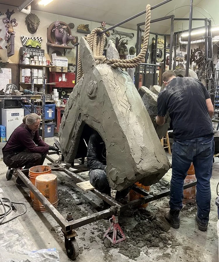 The crew tackled the sculpting of the giant tire horse head and tail today. The pieces weren’t overly large compared to many we do in our shop, but because of the many upside-down areas and the tight quarters, this was a challenging project. The morning was spent skillfully troweling on the fibreglass-reinforced-concrete. After the lunch break, the carving began to add the tire treads and other details. Tomorrow, the crew will tackle the giant tire entrance that forms the body of the horse. Stay tuned…