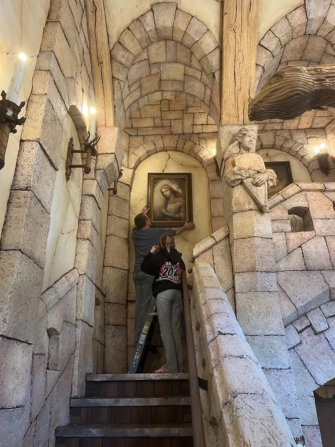 The Copper Crown construction is now behind us, but the suite still changes daily in a dramatic fashion. The decorating is now in full swing. Peter has finished framing the wall art, and today, with Juniper, hung it throughout the multilevel room. The furniture is being moved in, and the curtains are being fitted. If you want a peek inside the royal suite, the open house is in 66 days on June 6th, right after the Yarrow Days parade.