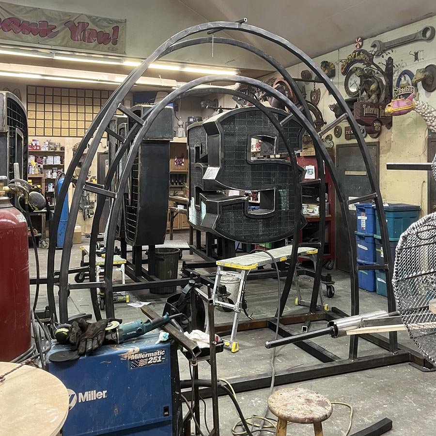 There was lots of progress on the letterswhen I was away! Matt finished welding the pencil rod letter armature fronts in place, and the crew has already tied the lath on four of the letters in readiness for sculpting beginning tomorrow morning. While the crew worked on the letters and prepared the mixing area, I began work on the structural steel for Kraay’s Horse Carousel entrance. Although it may not yet look much like a giant tire horse to most people, I can clearly see it. Stay tuned to watch it come together…
