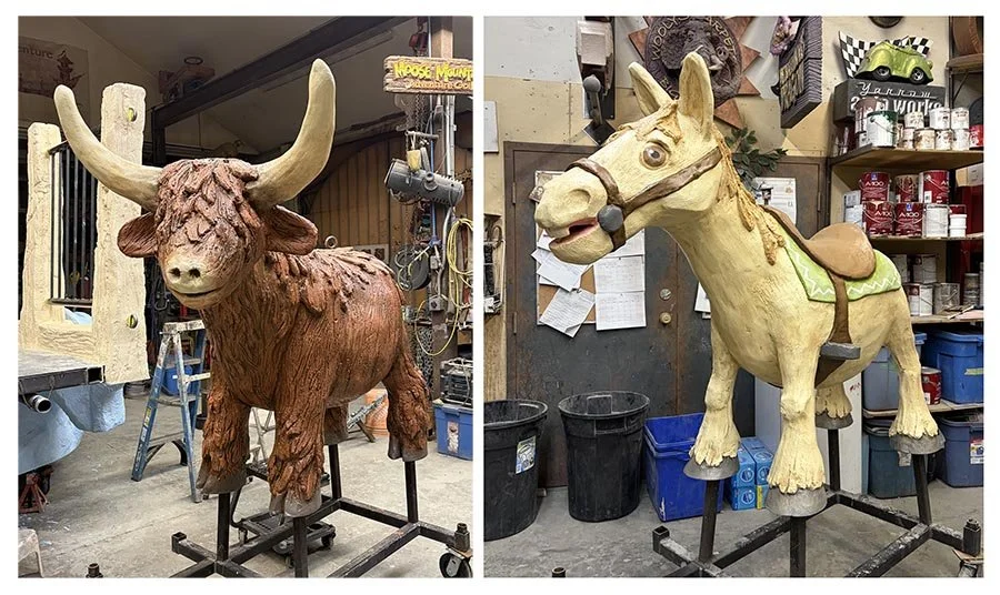 Jay worked hard today and managed to tidy up most of the painting and glazing on the roping horse (Would that make it a painted pony? :) )and Highland cow that will soon be on the way to Kraay’s Family Farm in Lacombe, Alberta. When the animals get to the farm, the kids will sit on the horse and then attempt to rope the cow, which should be a lot of fun!