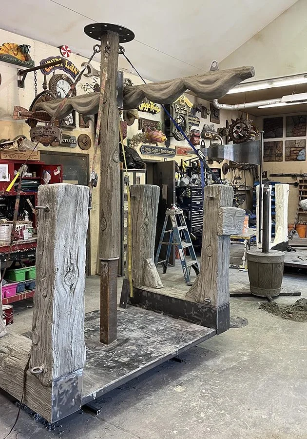 While the painting crew worked outside on the largest piece of Vala’s pirate ship, Matt and I welded, wired and mudded the last of the remaining sections of the mast. We’ve now been at this project for six and a half weeks, with two or three weeks to go before we are done. The weatherman is promising rain for the next couple of weeks, and we have plenty of work in the warm and dry shop to keep the crew busy. Stay tuned…