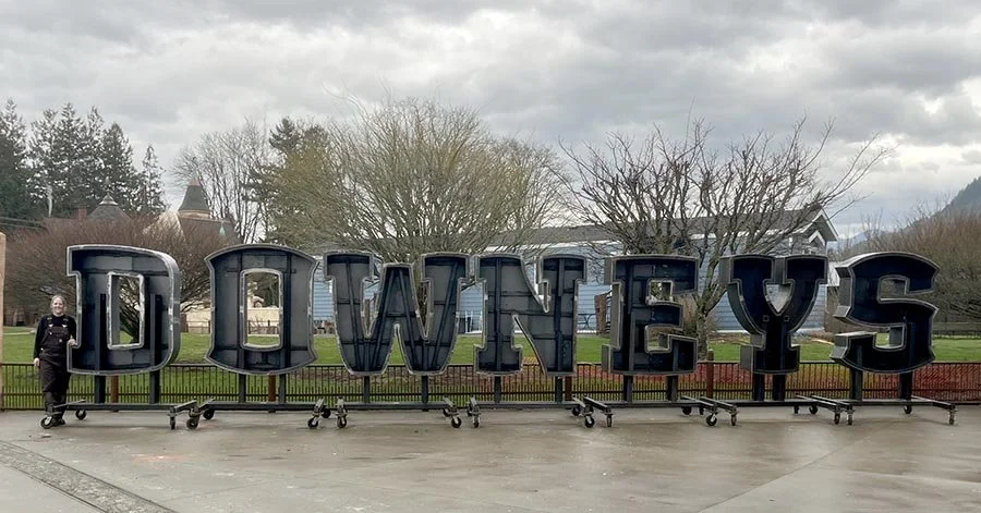 It was with great delight we finished the very last welds and grinding on the D of the giant DOWNEYS sign. This project involved nineteen 4’ x 8’ sheets of steel, fifteen lengths of structural square tubing and more than five hundred lineal feet of welds. As soon as the final letter was done we rolled it out to join the others for a quick photograph and then rolled four letters back into the shop to begin welding up the pencil rod armatures that will allow us to sculpt the woodgrains into the open fronts. Over the next days we’ll do the armature, tie on the diamond lath to ready the project for the sculpting next week. Stay tuned…